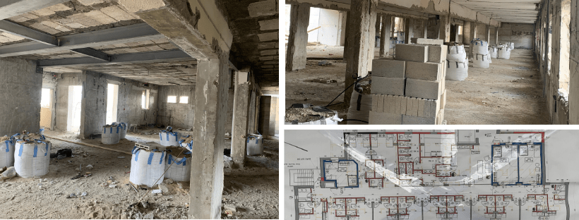 All room dividers are being built with concrete bricks, as is the norm in Israel. See below for photos of the recent progress, as the walls go up, and a short virtual video tour of the work being done.
