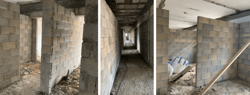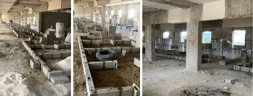 (Phase 1: Sectioning off Rooms)(Phase 2: Prepping cement blocks for room construction)(Phase 3: Finishing the walls, which will soon be dorm rooms, classrooms and student areas)